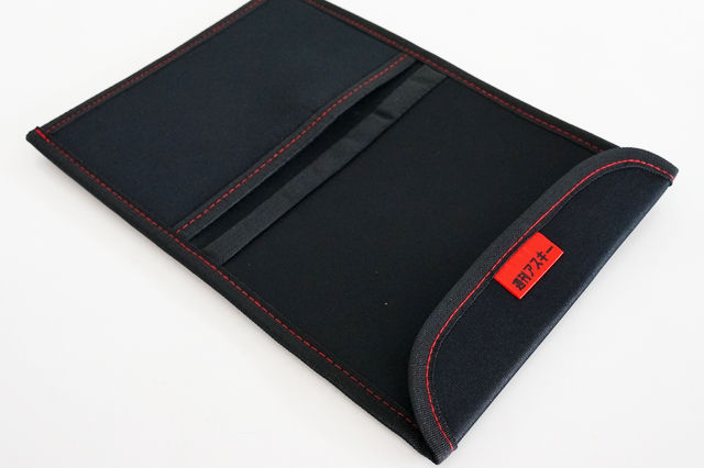 ブラックのケースに、赤い色のステッチ。
