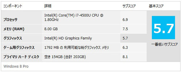 CPUの評価は、Core i7-4500U(1.80GHz)で、6.9。