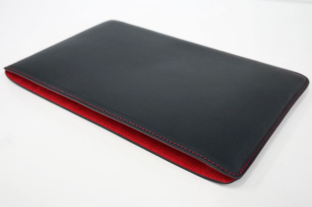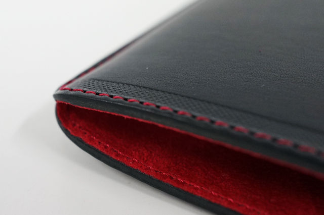 ブラックのレザーケースに、赤いステッチを施して、